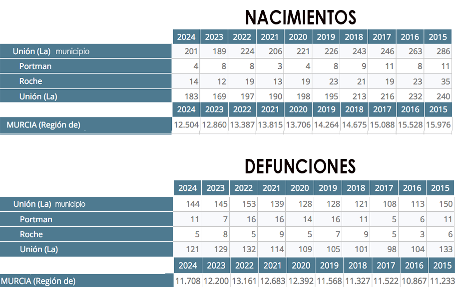 Los datos del año 2024, que se han hecho oficiales ahora, reflejan que los nuevos bebés de La Unión vuelven a situarse por encima de los doscientos anuales (201) tras registrar el año anterior la cifra más baja de la década. Por su parte, los fallecidos fueron 144 en dicho ejercicio, cantidad que se sitúa por debajo de la cifra más alta de los últimos diez años, que se dio en 2022 con 153.