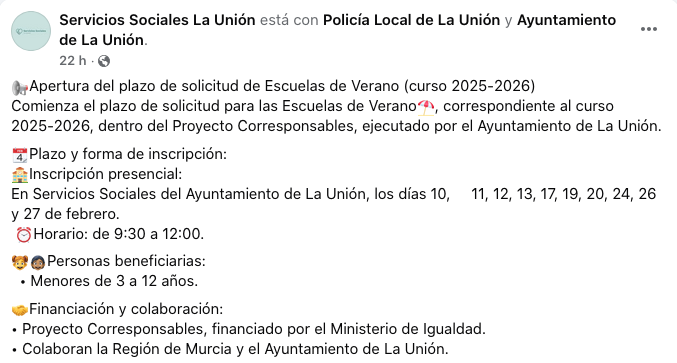 Servicios Sociales informa de la apertura del plazo de solicitud correspondiente al nuevo curso, dentro del Proyecto Corresponsables, ejecutado por el Ayuntamiento de La Unión. Los interesados tienen hasta el 27 de febrero para apuntar a menores de entre 3 y 12 años de edad.