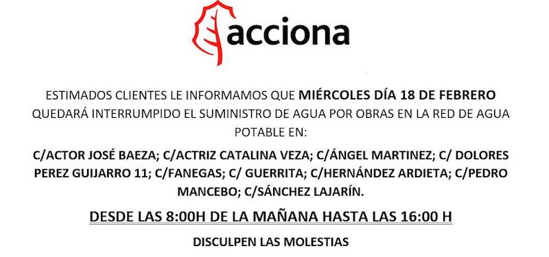 La Policía Local de La Unión da a conocer que Acciona llevará a cabo este miércoles quedará interrumpido el suministro de agua en las calles Actor José Baeza, Actriz Catalina Veza, Ángel Martínez, Dolores Pérez guiarra 11, Fanegas, Guerrita, Hernández-Ardieta, Pedro Mancebo y Sánchez Lajarín.