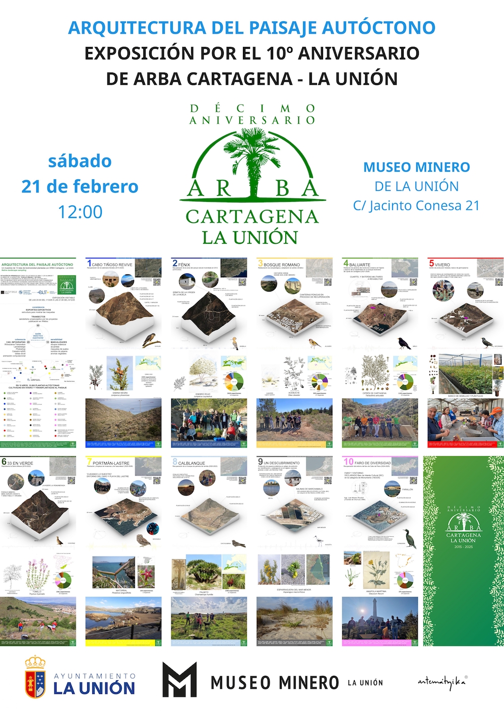 Descripción: muestra de las actuaciones para la reforestación del bosque autóctono en 10 lugares del litoral de Cartagena plagadas de hitos patrimoniales naturales y antrópicos, desde Cabo Tiñoso a Cabo de Palos, ejecutadas y en ejecución por la asociación ciudadana ARBA Cartagena –La Unión, conmemorando su décimo aniversario sembrando 10 islas de biodiversidad; una década mitigando la aridez en el sureste ibérico, la región semiárida más poblada de Europa. Los contenidos iniciales parte de una situación de aprendizaje experimental donde alumnos y ciudadanos colaboraron en el comisariado de una exposición sobre arquitectura del paisaje, usando la sala de dibujo en planta baja del CIM como una galería de arte urbano, produciendo contenidos analógicos y digitales con las herramientas habituales de la asignatura, y aplicando las habilidades creativas individuales de 20 alumnos por parejas.