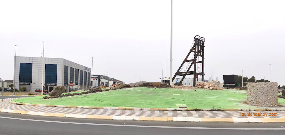 La simbología minera de las entradas a la urbe de La Unión están ampliándose con los trabajos que se llevan a cabo en la rotonda del polígono industrial de Lo Bolarín. Se han instalado castilletes de dos modelos diferentes y varias representaciones de pozos mineros.