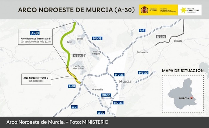4. Desde el lunes por la tarde está en servicio el último tramo de 8 kilómetros de la autovía de 22 kilómetros del Arco Noroeste que conecta Alcantarilla con Archena, con los que los residentes en La Unión que vayan hacia Madrid, por ejemplo, podrán tomarla en la bajada del Puerto de la Cadena, en la salida hacia Caravaca. Además, mejora la conectividad de municipios como Archena, Molina de Segura, Lorquí, Villanueva del Río Segura, Ceutí, Alguazas, Campos del Río, Las Torres de Cotillas o Alcantarilla, facilitando el acceso a polígonos industriales y el transporte de mercancías y reforzando así la actividad económica de una zona con un importante tejido productivo. La inversión del gobierno de España ha sido de 264 millones y esta nueva vía quitará unos 27.000 vehículos al día al ‘nudo de Espinardo’, que llevaba años con atascos, al enlazar las autovías hacia Andalucía, Alicante y las playas de la Costa Cálida con el tráfico de los residentes de la ciudad de Murcia.
