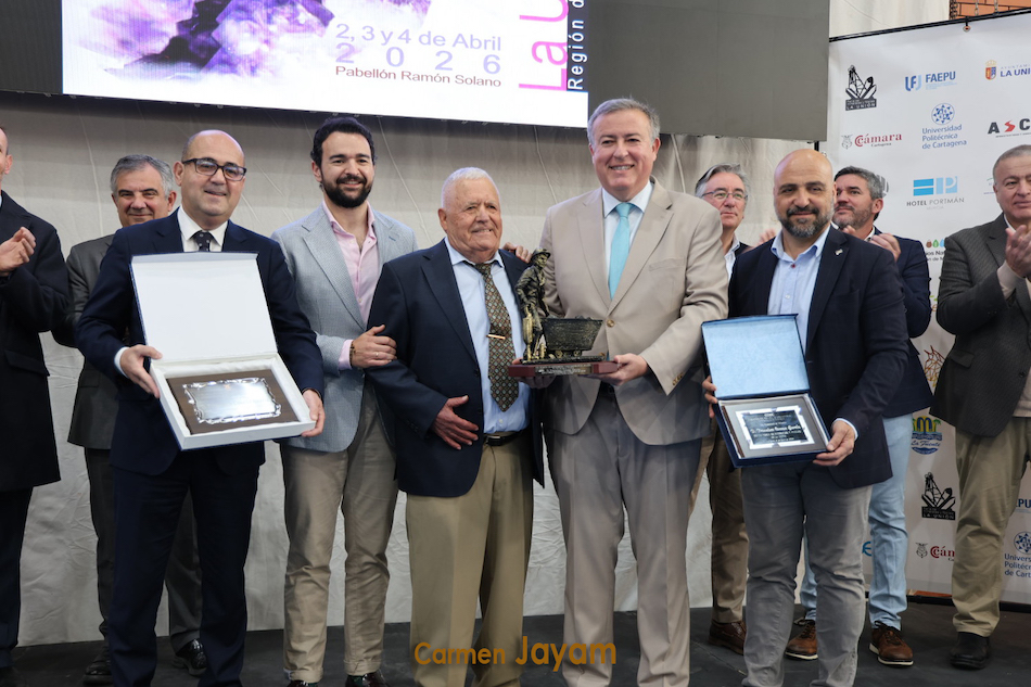 Francisco Conesa ha recibido una placa de manos del presidente de la Cámara de Comercio de Cartagena, Miguel Martínez Bernal, y otra que le entregaba Francisco Bernal de COEC Cartagena, además de una reprodución de un minero con su vagoneta, que entregaba el presidente de FAEPU y de la Feria, Carlos Fernándo Bernabé Pérez.
