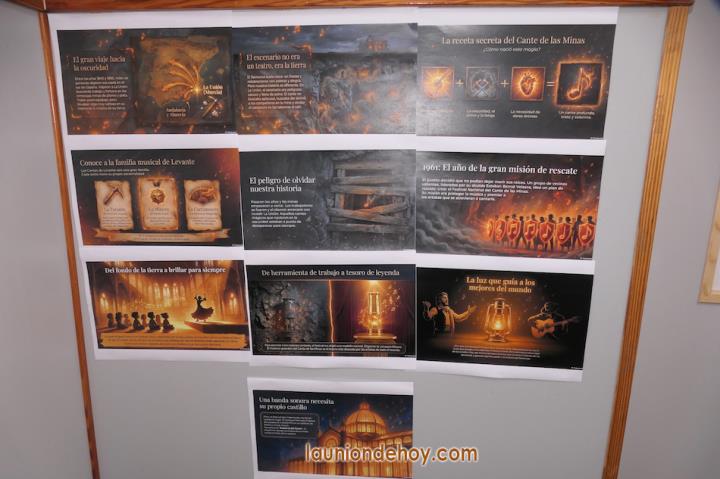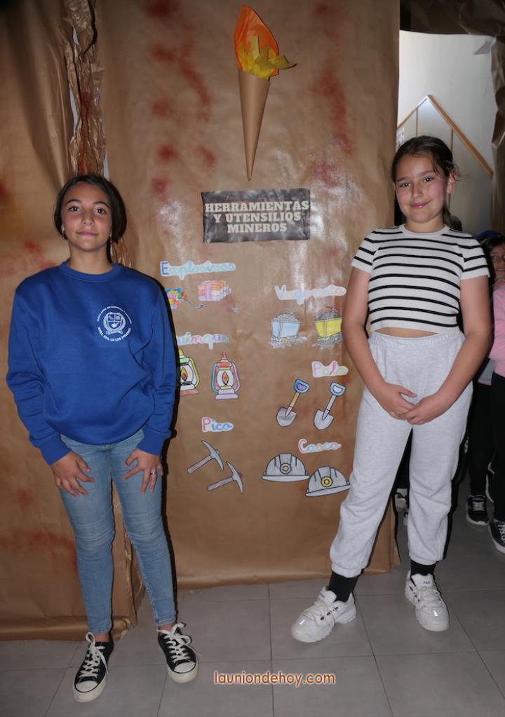 Cruzamos la réplica, en papel, de la entrada a una mina. Ya estamos dentro de la Agrupa Vicenta, área trabajada por el tercer ciclo infantil. Vemos desde cómo eran estas instalaciones recreadas con piezas y los 'playmóbil', hasta paneles recordando las herramientas y utensilios que se utilizaban o, entre otras imaginativas creaciones, con vagoneras que aparentan llevar mineral. "El minero baja a la tierra como quien entra en un templo", leemos también con las palabras adosadas entre los peldaños de una escalera. En otra también se puede leer 'La Unión romana y minera'.