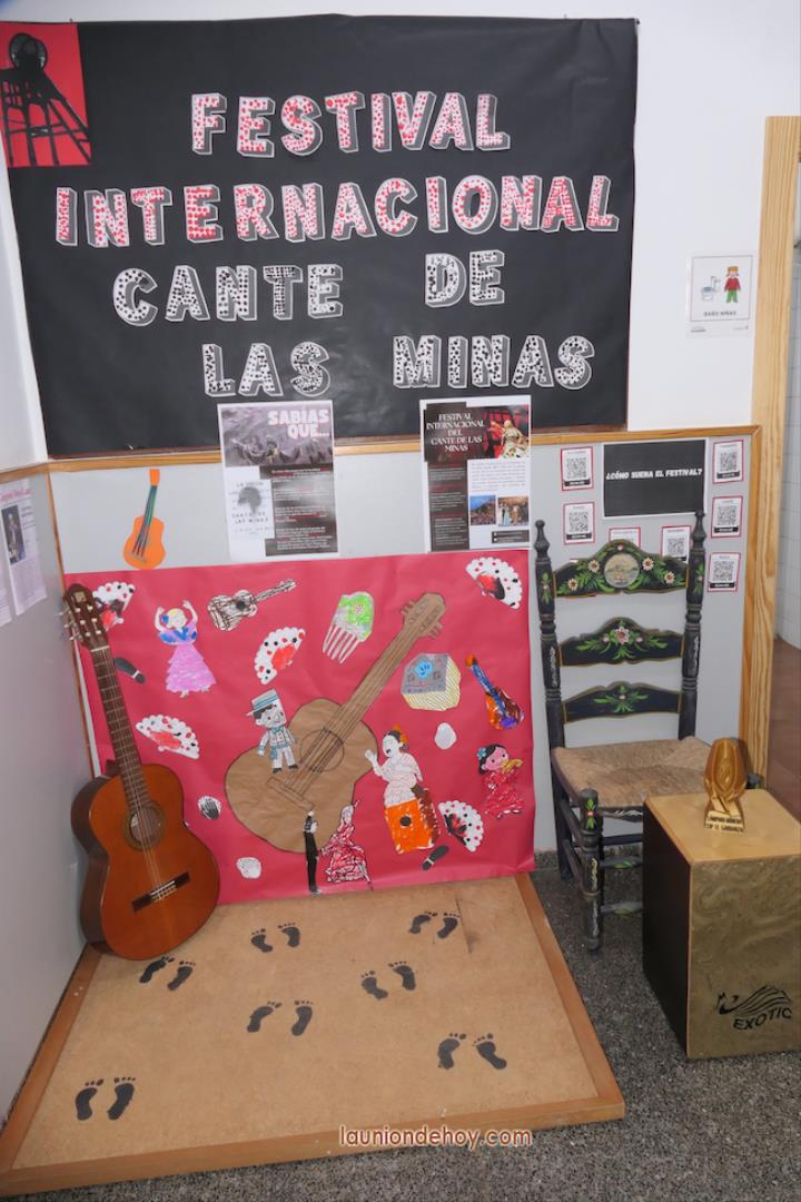 Comenzamos en el edificio central por la zona del Cante de las Minas, con un rincón muy típico con silla, cajón y guitarra, entre otros elementos, como dibujos pintados por el alumnado y la reproducción en una copiado 3D del máximo galardón del internacional evento jondo. Además, podemos ver carteles de diferentes ediciones del festival (nos apuntan que el de 1971 era desconocido en el archivo municipal y ahora se le hará una copia) y un panel de los que han creado alumnos.
