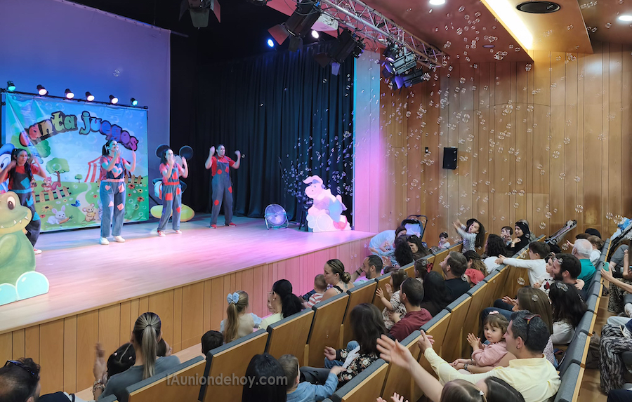 Un elevado número de niños y sus familiares pasaron una tarde muy animada en el salón de actos del Museo Minero con el cantajuegos del grupo 'Fantasía' titulado 'Bailando con burbujas'.