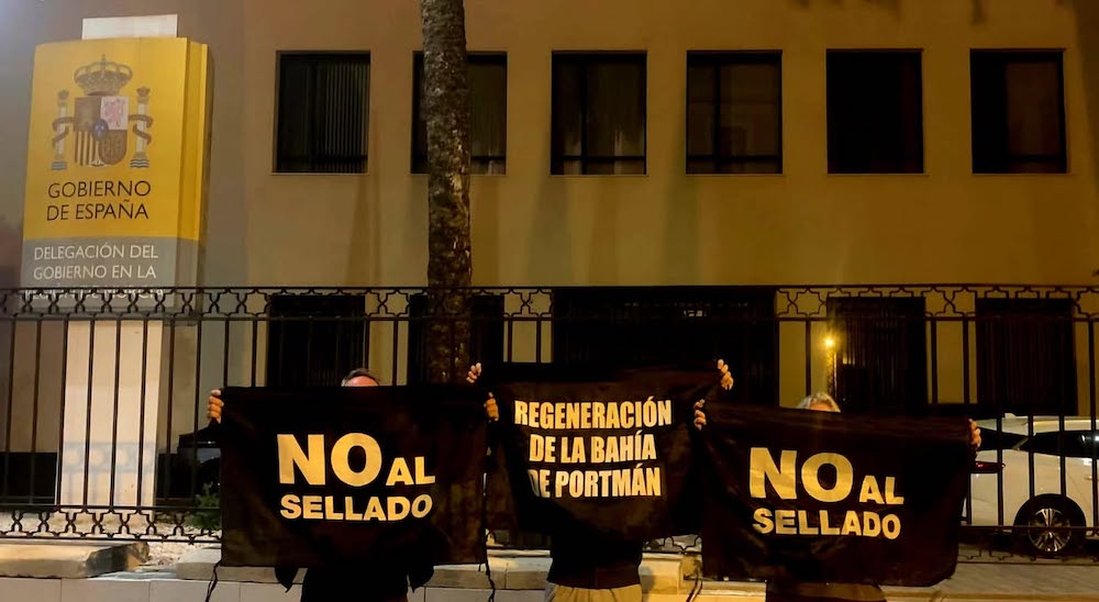 Imagen de la protesta de varios vecinos que, para dejar claro que el deseo de la inmensa mayoría es la regeneración (al menos parcial) de a bahía de Portmán, ha tenido lugar esta pasada noche en la sede en la ciudad de Murcia de la delegación del gobierno de España en nuestra región.
