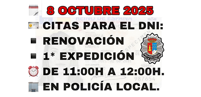 La Policía Local de La Unión informa a la ciudadanía que en sus instalaciones de la plaza García Mateos se darán citas de renovación y primera expedición del documento nacional de identidad este miércoles para el 14 de octubre con el equipo móvil de Policía Nacional, siendo la fecha del 21 de octubre.