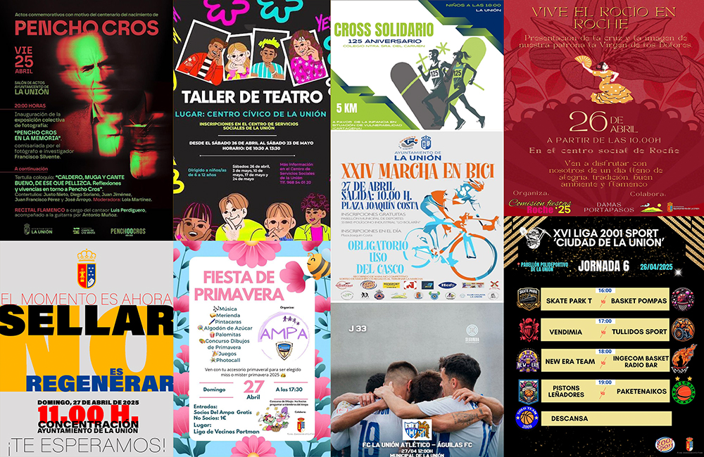 Una exposición y una tertulia en torno a Pencho Cros abre unas jornadas muy intensas, que también incluyen taller de teatro, cross solidario Vedruna, marcha cicloturista y las fiestas rociera de Roche y de primavera en Portmán. El domingo es para la concentración contra el sellado de la bahía y puede ser el gran día del ascenso de La Unión Atlético dentro de un mundo del deporte del que también ofrecemos horarios de los partidos federados del CD Vedruna y CB Sierramar, además de la sexta jornada de la liga local de baloncesto '2001 Sport'.