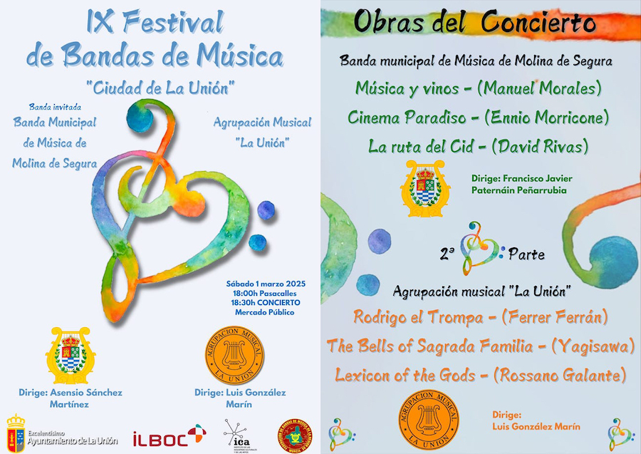 La novena edición del festival que organiza la Agrupación Musical La Unión llega esta tarde con la banda municipal de Molina de Segura como invitada. Si el tiempo lo permite, habrá un pasacalles conjunto a partir de las seis de la tarde, para media hora más tarde comenzar el concierto en el Mercado Antiguo, con entrada gratuita.