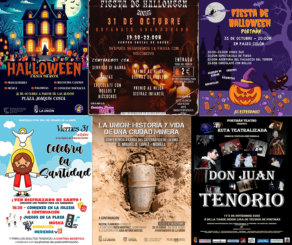 Las propuestas del fin de semana tiene hoy su día más fuerte con las fiestas de ‘Halloween’ y ‘HolyWins’, además de un encuentro de la justicia regional y una conferencia histórica. El sábado y el domingo será para la representación teatral de ‘Don Juan Tenorio’ en Portmán. Además hay fútbol sala, voleibol y fútbol base, pues en las divisiones mayores descansa el CD Ciudad de La Unión. Tampoco hay jornada en baloncesto.