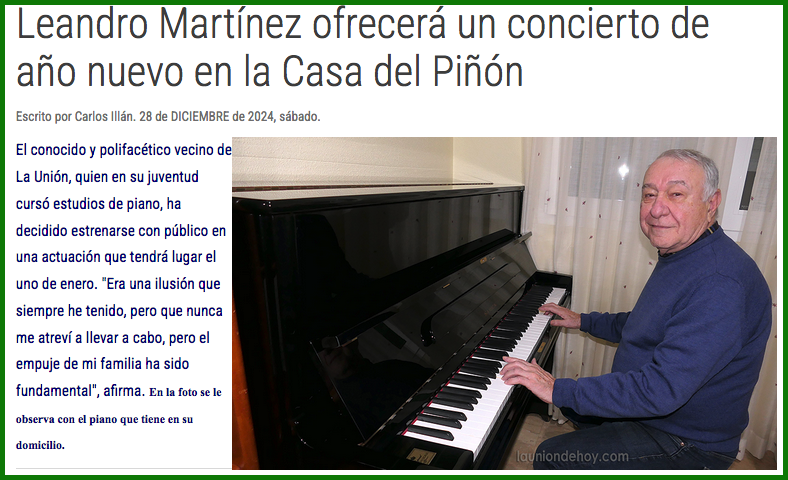 ... porque el anuncio de su celebración en el Mercado Antiguo se trató de una inocentada del periódioco de La Unión y su gente, que, de forma excepcional y dado su buen calado, hemos prolongado tres días para desmentirla, lo que ha potenciado su efecto. Leandro Martínez Bermúdez, a quien hay que agradecer siempre su buen humor, sí tiene el piano con el que aparecía en las fotografías, pero carece de los estudios de música a que hacíamos referencia en el texto.