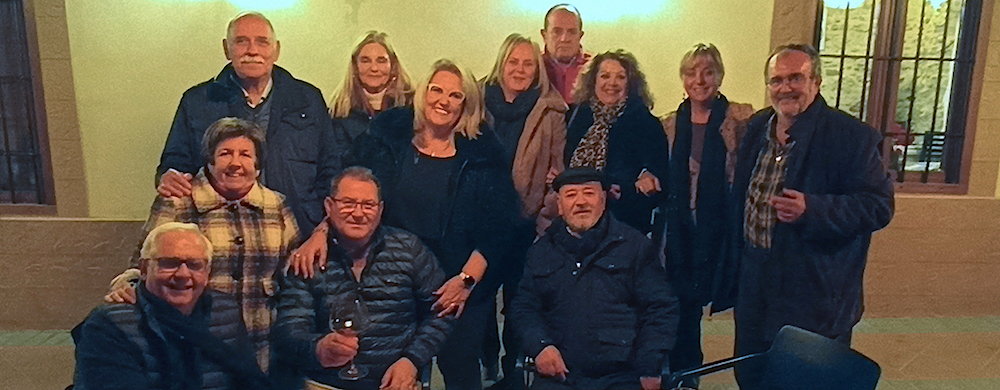 Pedro, Maricarmen, Juanamari, Toñi, Ñoño, Maricarmen, Marian y Carlos de pie, con Alfonso, Fina, Paco y Juan Antonio sentados, de izquierda a derecha, en un encuentro navideño de amigos en el restaurante 'Tienda de Solita'.