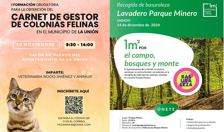 Ademas de los eventos que tienen lugar esta semana, ya hay fechas para otros que vendrán en las siguientes, como será el curso de formación para obtener el carné de gestor de colonias felinas en el municipio, que tendrá lugar el 30 de noviembre en el salón de actos de la Casa del Piñón, y una recogida de basuraleza en el Parque Minero para el sábado 14 de diciembre.