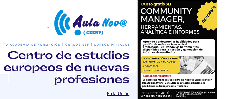 En Aula Nova, tu centro de formación de La Unión, abrimos inscripción para una formación del SEF (Servicio de Empleo y Formación de la Región de Murcia) pensada para impulsar tu perfil profesional.