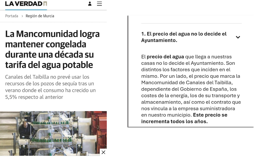 Defiende La Unión: "Hace un mes, el PP y el equipo de gobierno nos quisieron subir el agua con una serie de excusas e incluso dirigió una carta a los ciudadanos para intentar convencerlos. Una de las cosas que venía en esa carta y nos contaba el sr. alcalde queda en evidencia con este anuncio que ha realizado en prensa la Mancomunidad de los Canales del Taibilla en el diario La Verdad (...)