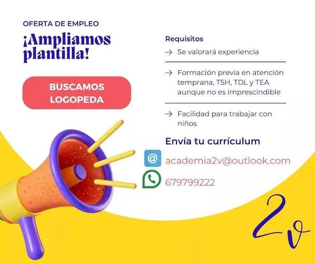 La academia de formación de El Algar lanza una oferta de empleo para logopeda. Se valorará experiencia, facilidad para trabajar con niños y formación previa en atención temprana, TSH, TDL y TEA, aunque no es imprescindible. Interesados mandar currículum al correo Esta dirección de correo electrónico está siendo protegida contra los robots de spam. Necesita tener JavaScript habilitado para poder verlo. o por WhatsApp al teléfono 679799222.