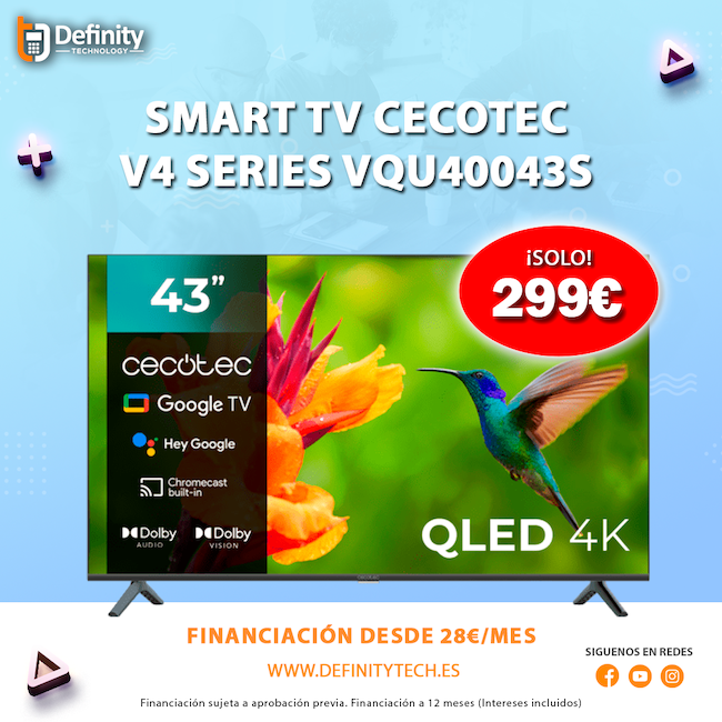 Móviles Iphone 16 Pro Max 256 GB por sólo 1339 euros con financiación de 68 euros al mes y un televisor de 43 pulgadas Smart TV Cecotec V4 Series VQU40043S por sólo 299 euros.