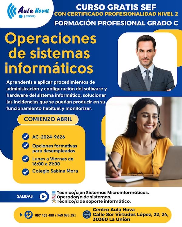 Desde Aula Nova queremos informarte acerca de una acción formativa que pensamos se ajusta perfectamente a tu itinerario formativo-profesional, ampliando tu formación continua y mejorando tus opciones de inserción en el mundo laboral. Comienza en abril.