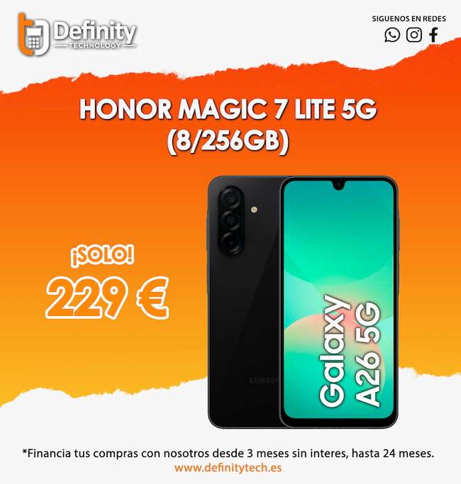 Definity Technology pone muy a tu alcanza un terminal Galaxy A26 5G y un Honor Magic 7 Lite, respectivamente, por sólo 229 y 349 euros. Además, puedes financiar tus compras con nosotros desde 3 meses sin intereses.