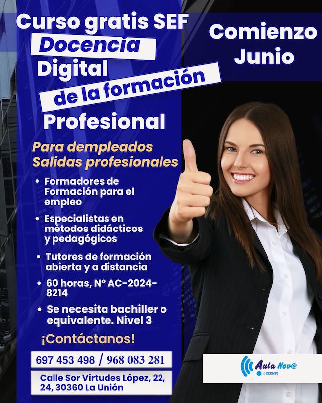¿Te apasiona la formación y quieres dar el salto al mundo digital? Esta es tu oportunidad para adquirir competencias clave en el ámbito educativo. cción formativa Nivel 3 (requiere Bachillerato o equivalente) subvencionada por el SEF (Servicio de Empleo y Formación) y dirigida a personas desempleadas. ¡Fórmate sin pagar un euro!
