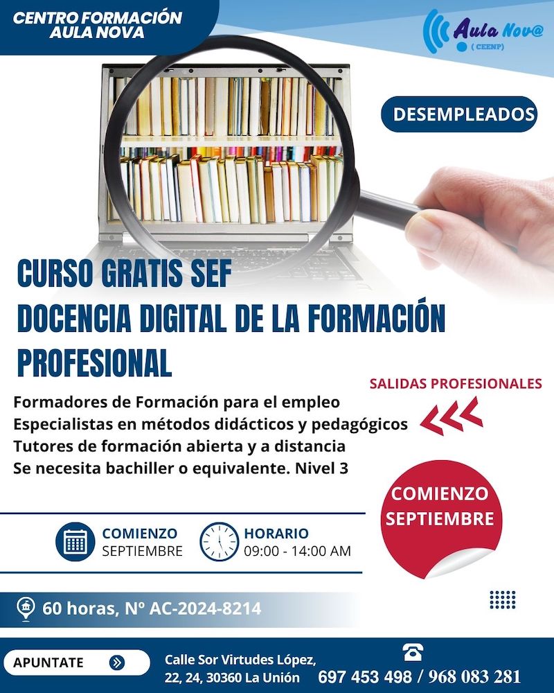 #AulaNova #FormaciónGratuita #DocenciaDigital #SEF #LaUnión #Nivel3 #CursosMurcia #FormaciónParaElEmpleo #educacióndigital