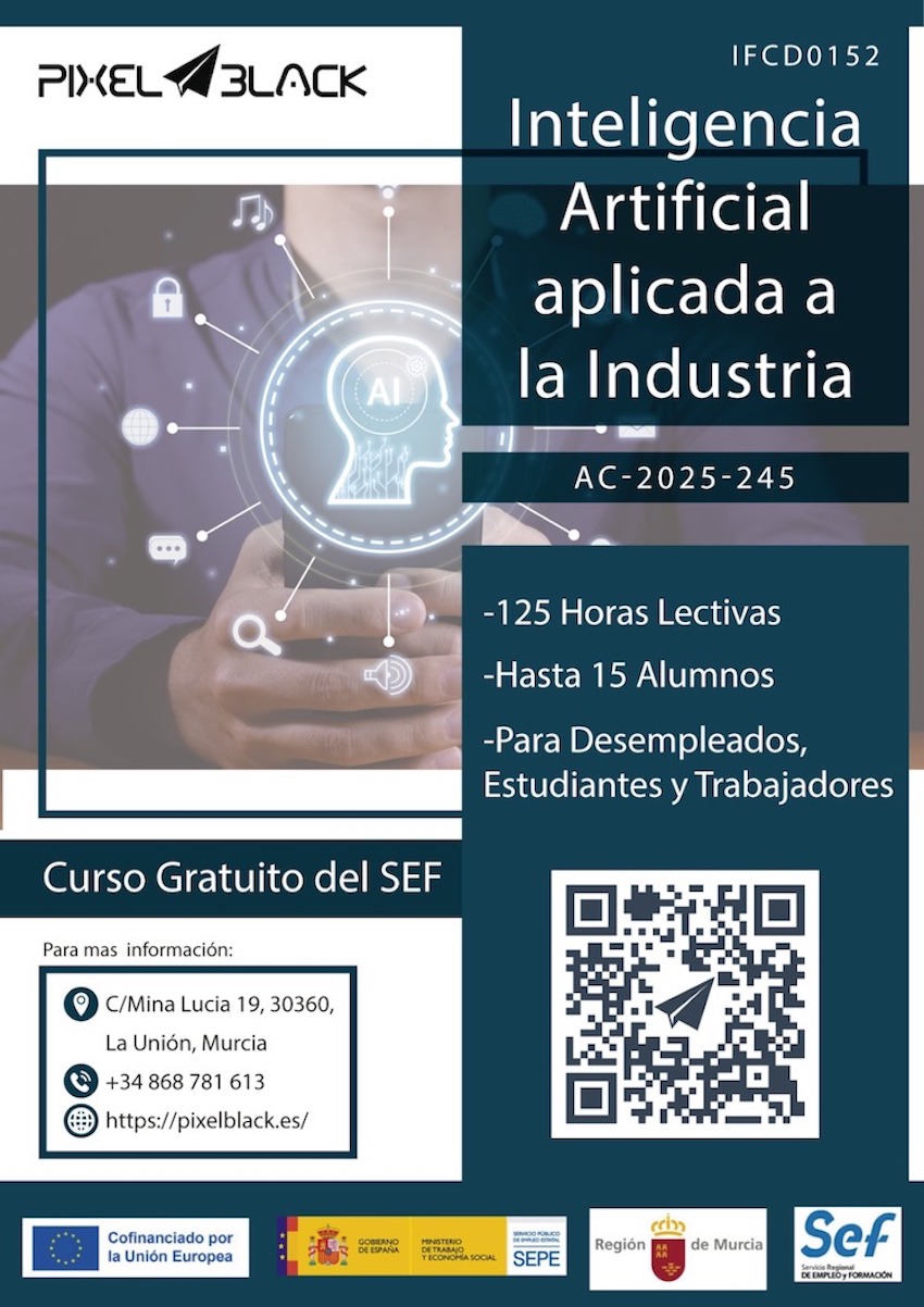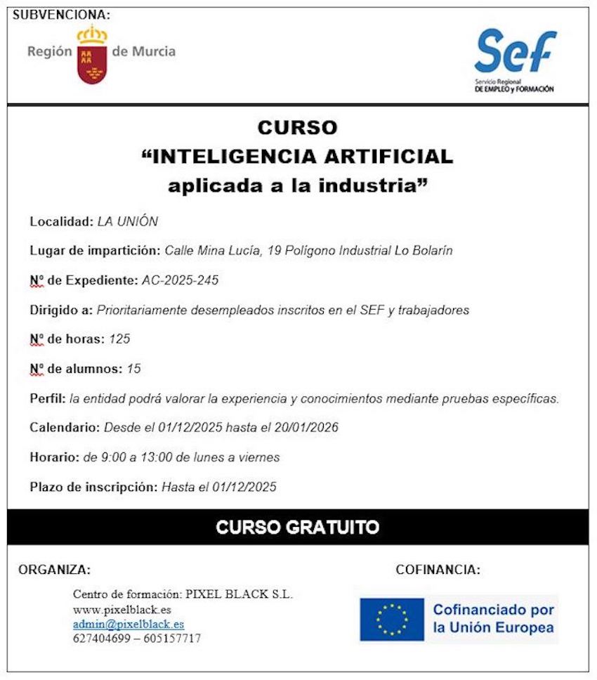 El centro de formación sito en el polígono industrial de Lo Bolarín lanza dos nuevos cursos gratuitos para desempleados, estudiantes y trabajadores, en general. Uno es 'Inteligencia artificial aplicada a la industria' y otro es 'Programación para videojuegos en Unity'. Ambos fija el tope de alumnos en 15, por lo que no debes tardar en apuntarte para asegurar plaza.