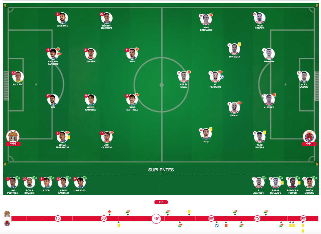 La Deportiva Minera jugó de inicio con Álex Lázaro, Mirapeix, Álex Macías, Javi Vea, Kamal, Rubén mesa, Kike Carrasco, Paco Torres, Kevin Toner, Omar Perdomo y Pitu.
