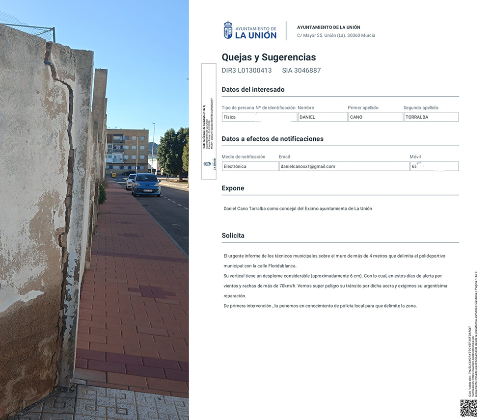Defiende La Unión informa que, hace unas semanas, registró en el ayuntamiento un escrito que reflejaba “la preocupante situación en la que se encuentra el muro del polideportivo municipal en su confluencia con la calle Floridablanca, con una estructura claramente deteriorada, con grietas visibles y un riesgo considerable de derrumbe, con el consiguiente peligro al tratarse de una zona de vía pública muy transitada. Esta semana, nuestro concejal, Daniel Cano, se ha reunido con técnicos municipales para conocer de primera mano las actuaciones que se van a llevar a cabo para solucionar este problema.