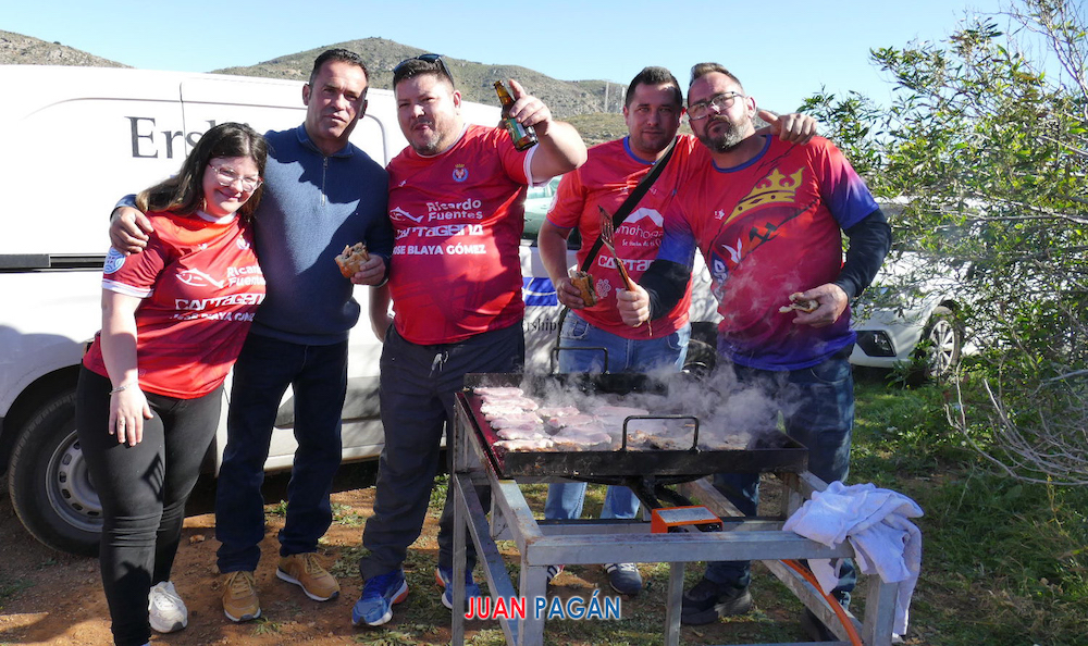 El presidente, José Blaya, con aficionado que montaron una barbacoa junto al campo de fútbol