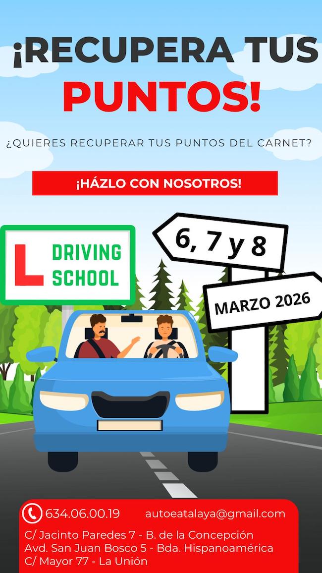 La autoescuela, que tiene uno de sus centros en la calle Mayor de La Unión, habilita los días 6, 7 y 8 de marzo para celebrar jornadas para recuperar los puntos del carne de conducir que se hayan perdido.