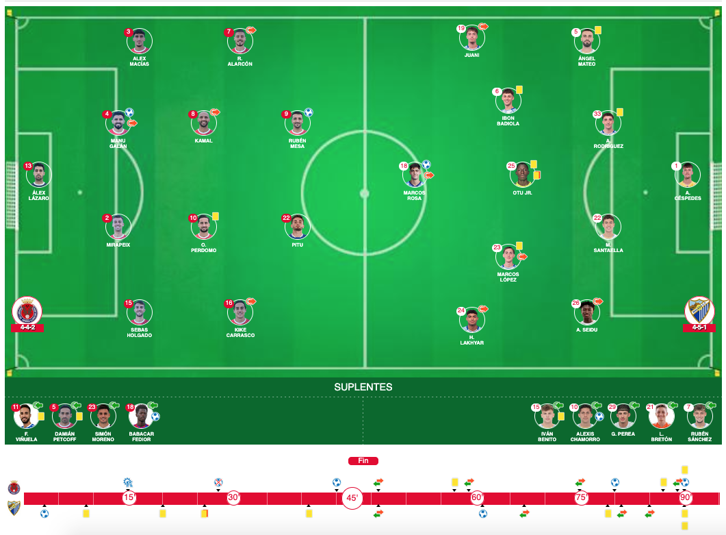GOLES. 0-1. Minuto 3: Marcos Rosa. 1-1. Minuto 45+1: Rubén Mesa. 1-2. Minuto 61: Alexis. 2-2. Minuto 80: Manuel Galán, de remate cabecero tras un saque de esquina. 3-2. Minuto 90+6: Babacar..