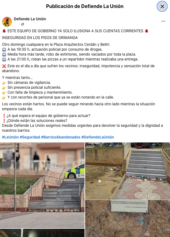 Defiende La Unión denuncia que los vecinos de la plaza Arquitectos Cerdá y Beltrí han tenido este domingo por la tarde una actuación policial por consumo de drogas para después tener lugar robos de extintores, que fueron vaciados en la plaza, y de pizzas. "Este es el día a día que sufren los vecinos: inseguridad, impotencia y sensación total de abandono", indican, anunciando que, una vez más, "pediremos, a través del registro municipal, la colocación de cámaras, más presencia policial en nuestras calles y más mantenimiento de esa plaza y otros parques del municipio".