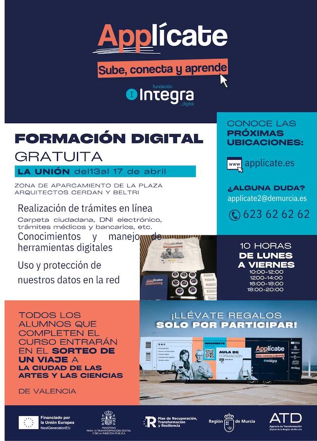 La unidad móvil del programa de formación gratuita en competencias digitales Applícate: Sube, conecta y aprende, promovido por la Fundación Integra Digital y el Gobierno de la Región de Murcia, volverá a La Unión del 13 al 17 de abril, con el objetivo de acercar las nuevas tecnologías a la ciudadanía y facilitar el uso cotidiano de herramientas digitales.