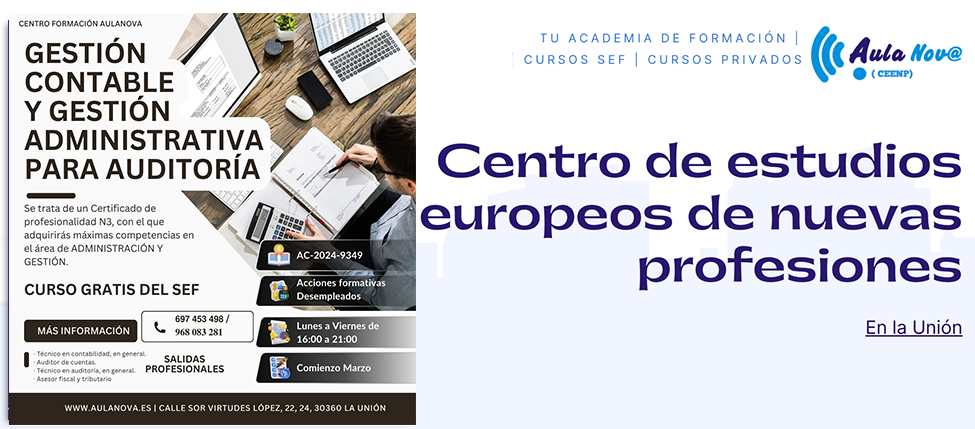 Desde AULA NOVA te presentamos una nueva acción formativa del Servicio de Formación y Empleo (SEF) de la Comunidad Autónoma diseñada para impulsar tu desarrollo profesional y ampliar tus opciones de inserción laboral.