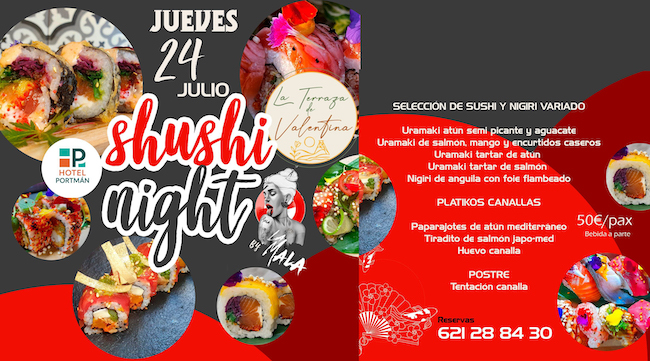 La prestigiosa marca protagoniza la 'Shushi night' que organiza hoy 'La terraza de Valentina' en el Hotel Portmán con una selección de sushi y nigiri variado, 'platikos canallas' y postre. Precio por comensal de 50 euros. Plazas limitadas.