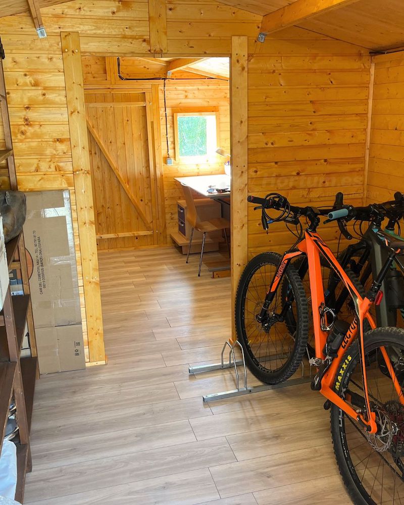 En lugar de dejar que esos espacios en tu jardín o terraza se queden sin uso, el cobertizo Dan te ofrece la oportunidad de transformarlos en áreas que realmente contribuyen a tu hogar. A continuación te mostramos un ejemplo de este garaje dividido en dos secciones, una para almacenar bicicletas y equipo deportivo, y otra como un pequeño estudio exterior. Un modo de conseguir un rinconcito ordenado y funcional que antes era solo un espacio vacío.