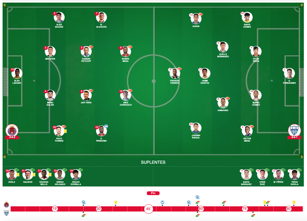 Anteriormente decíamos que el travesaño iba a volver a hacer acto de presencia, y fue en el minuto 56 cuando volvió a salvar al equipo visitante. Un zapatazo de Álex Macías se topaba de nuevo con el larguero, que escupía otra ocasión clarísima para la Minera. Tres minutos después, la madera volvía a negarle el gol al conjunto rojillo. Esta vez el poste, para evitar el gol olímpico de Omar Perdomo.