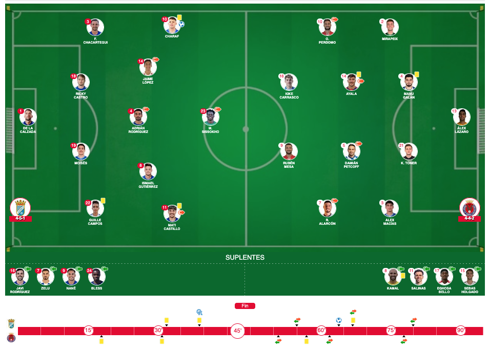 DEPORTIVA MINERA. Álex Lazaro, Mirapeix, Álex Macías, Manu Galán, Petcoff, Ayala (reemplazado por Kamal en el minuto 51), Roberto Alarcón (Salinas, 61), Rubén Mesa, Omar Perdomo, Kike Carrasco y Kevin Torner.