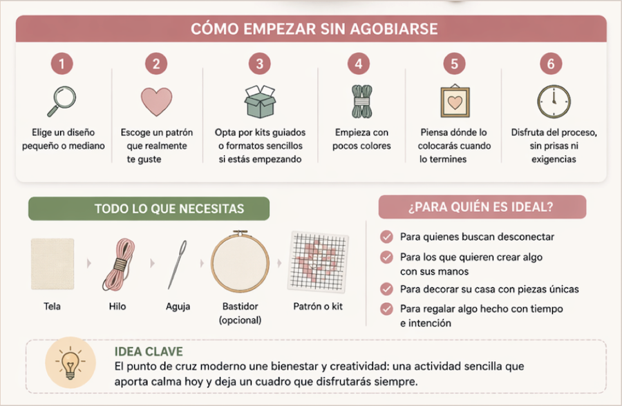 Una de las razones por las que el punto de cruz moderno conecta tan bien hoy es que une dos cosas que muchas personas valoran mucho: bienestar cotidiano y decoración con personalidad.