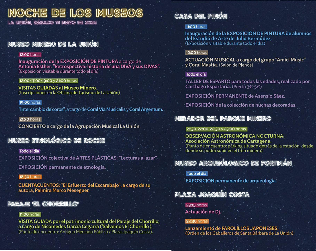 El sábado dominan las propuestas de 'La noche de los museos' por la ciudad y sus pedanías, además del bingo solidario por Asido, el partido copero de fútbol sala del CD Vedruna y de las semifinales de la liga local de baloncesto '2001 Sport', que el domingo tendrá la final en un ambiente de fiesta. También ese día se monta la 'Cruz de mayo' en Portmán y juega su último partido como local en esta temporada el CD Ciudad de La Unión de fútbol.