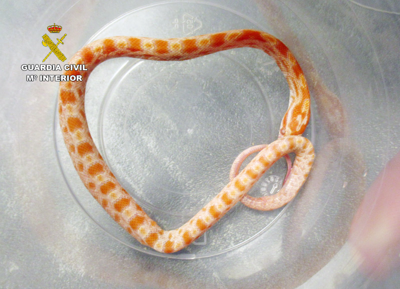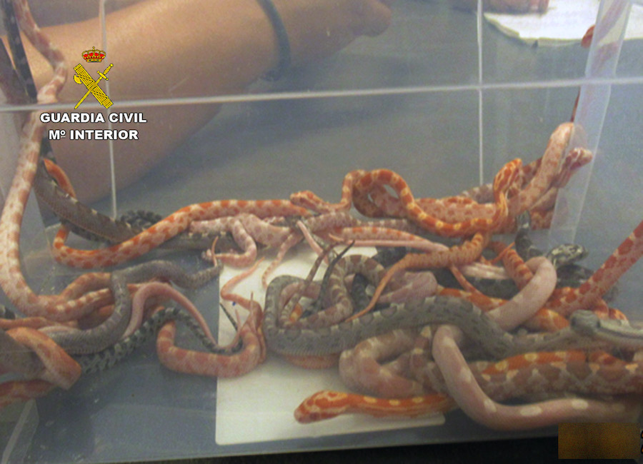 A la vista del posible hallazgo de algún animal vivo dentro, al lugar se desplazaron guardias civiles del Servicio de Protección de la Naturaleza. Los agentes descubrieron que la caja contenía un envase plástico donde se localizaron 26 crías de serpiente del maíz y un gecko.