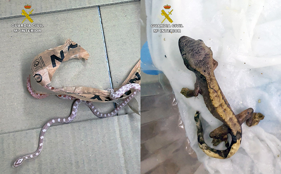 Una de las serpientes estaba muerta, mientras que otras cinco presentaban heridas al haberse pegado a la cinta adhesiva del propio envoltorio, por lo que fueron atendidas por servicios veterinarios especializados.
