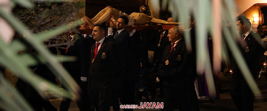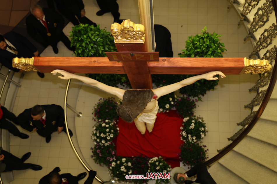 La imagen del emblemático crucificado que descendió ayer desde la mina Agrupa Vicenta quedó instalada en la entrada de la modernista sede municipal, la Casa del Piñón, donde puede ser visitada por los vecinos hasta que acabe la Semana Santa Minera. Se trata de una réplica estrenada en el año 2022 de la talla original, que se encuentra en la iglesia del Rosario.