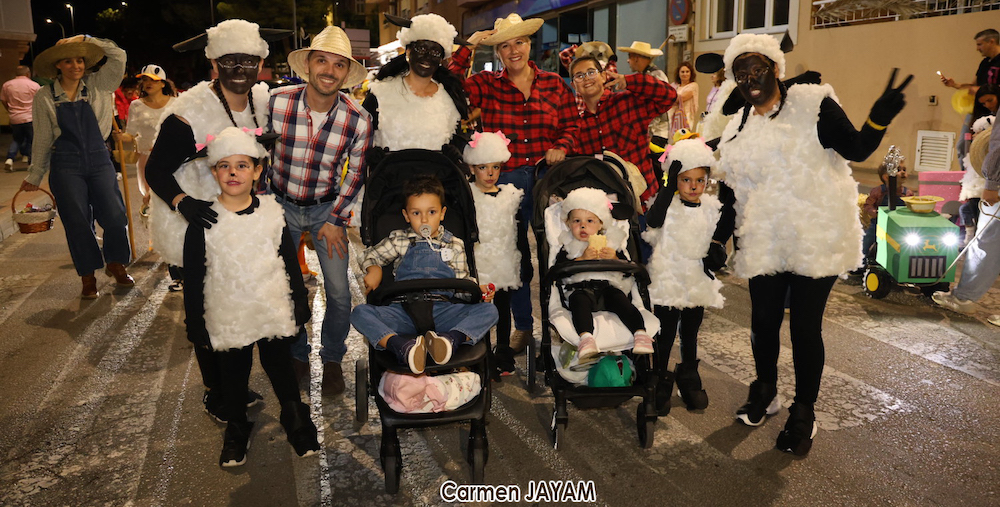 La variedad e imaginación en los vestuarios de los participantes lució en la cabalgata de disfraces, que tuvo a la peña 'Piripipao' como vencedor infantil con granjeros y ovejas (foto superior), mientras que la comparsa 'Amalia' triunfo en adultos.