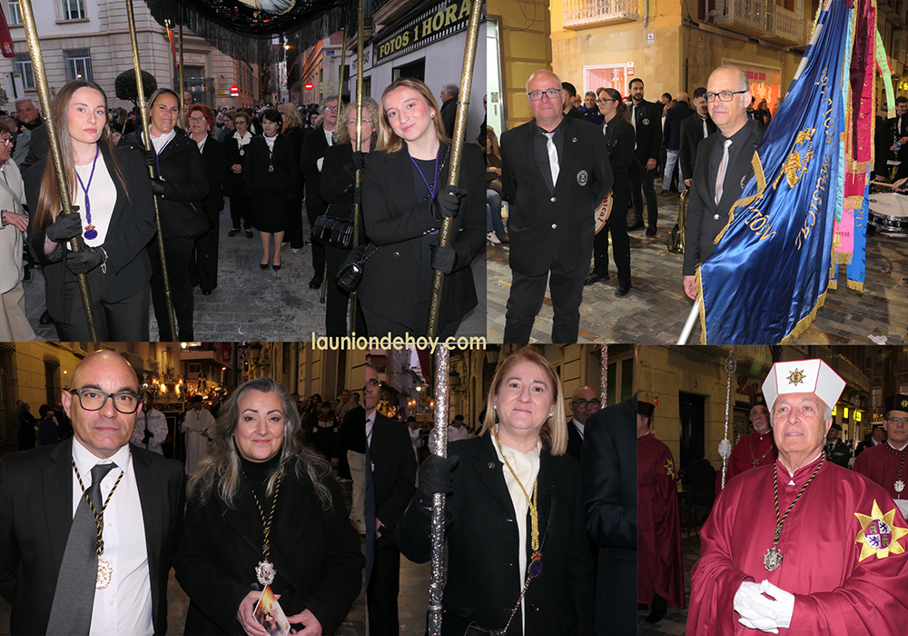 El 'vía crucis' de la quinta cofradía de la ciudad de Cartagena contó en su comitiva con nueve integrantes de Jesús Nazareno y unos sesenta componentes de la Agrupación Musical La Unión, además de otros vecinos a nivel individual, incluidos los troveros Irene Vicente y Paco Paredes, quienes hacen historia al formar parte del elenco de repentizadores que dedicó trovos (en lugar de saetas) en un cortejo pasionario.