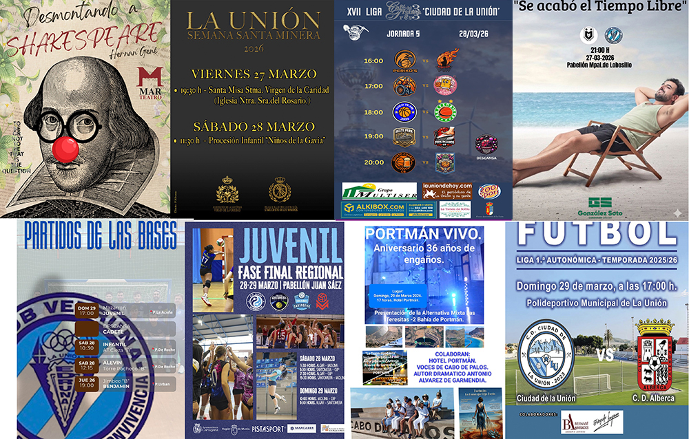 Llega el fin de semana del cambio de hora, cuando los relojes se adelantan. Las propuestas se activan hoy para La Unión con la misa en honor a la Virgen de la Caridad, el teatro y el partido del CD Vedruna de fútbol sala. El sábado es para saborear, pues empiezan las procesiones en la capital de la Sierra Minera, se clausura el certamen teatral y es noche para recibir distinciones, como el que recibirá el club de atletismo en Águilas y la cofradía en Cartagena. El día siguiente comenzará con las procesiones del Domingo de Ramos. Por la tarde, el 36 aniversario 'infeliz' de la 'degeneración' de la bahía, con acto en el Hotel Portmán. También ofrecemos agenda de voleibol, fútbol sala y de algunos partidos de fútbol como el Ciudad de primera autonómica y el juvenil de la AD La Unión. También de baloncesto, tanto en las competiciones federadas como en la liga local, que llega a la quinta jornada con todos los partidos en 'La Bombonera'.