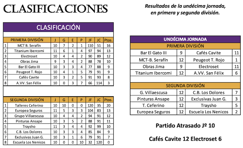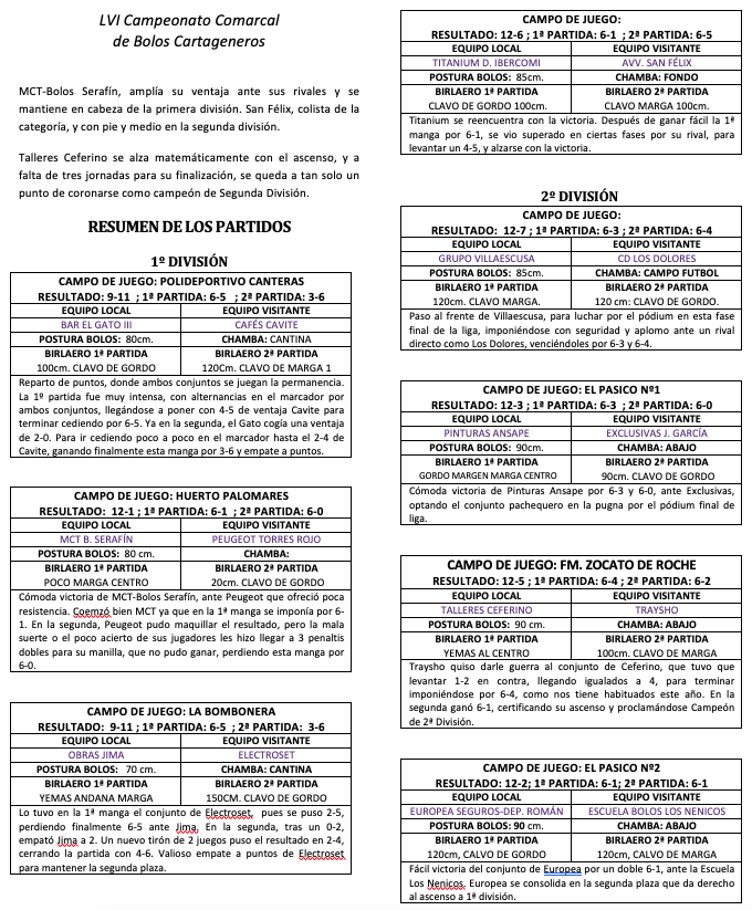 MCT-Bolos Serafín se mantiene en cabeza de primera división del campeonato comarcal ampliando su ventaja sobre sus rivales y siendo Titanium Ibercomi (foto adjunta) el único que lo acecha. Por su parte, San Félix, colista de la categoría, está con pie y medio en la segunda división, categoría en la que Talleres Ceferino ya tiene de forma matemática conseguido el ascenso a falta de tres jornadas para su finalización y con un punto más que logre también será campeón del grupo.