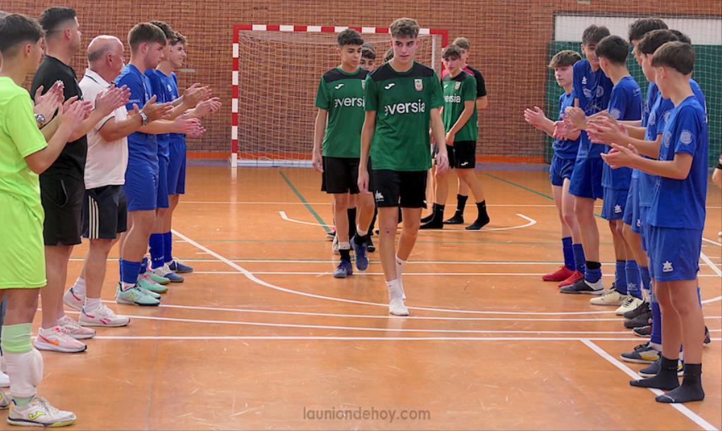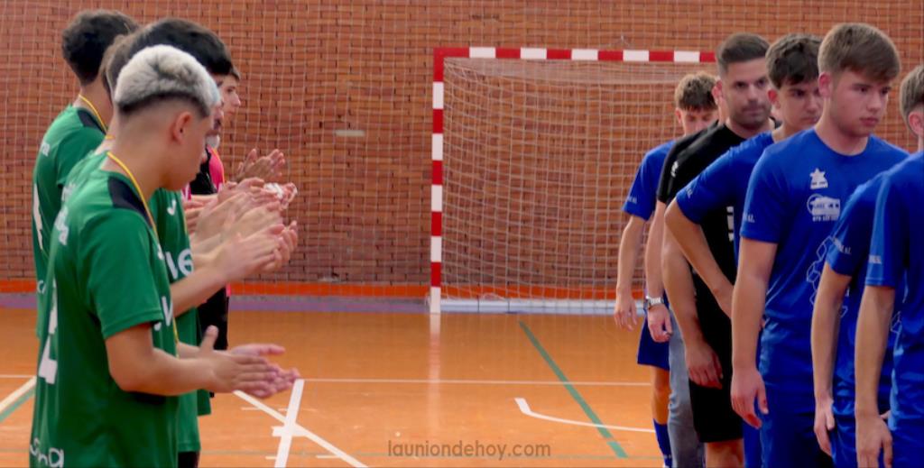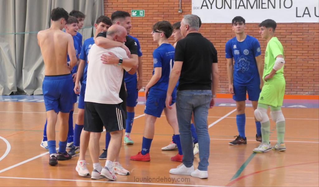 El equipo unionense de fútbol sala derrota a un CD Cordillera que le había ganado los dos partidos de liga y alza la copa regional cadete ante más de cuatrocientos personas en el pabellón de La Unión. En la foto, escena tomada nada más acabar el encuentro donde se observan el júbilo local, la resignación murciana y la deportividad entre ambos.