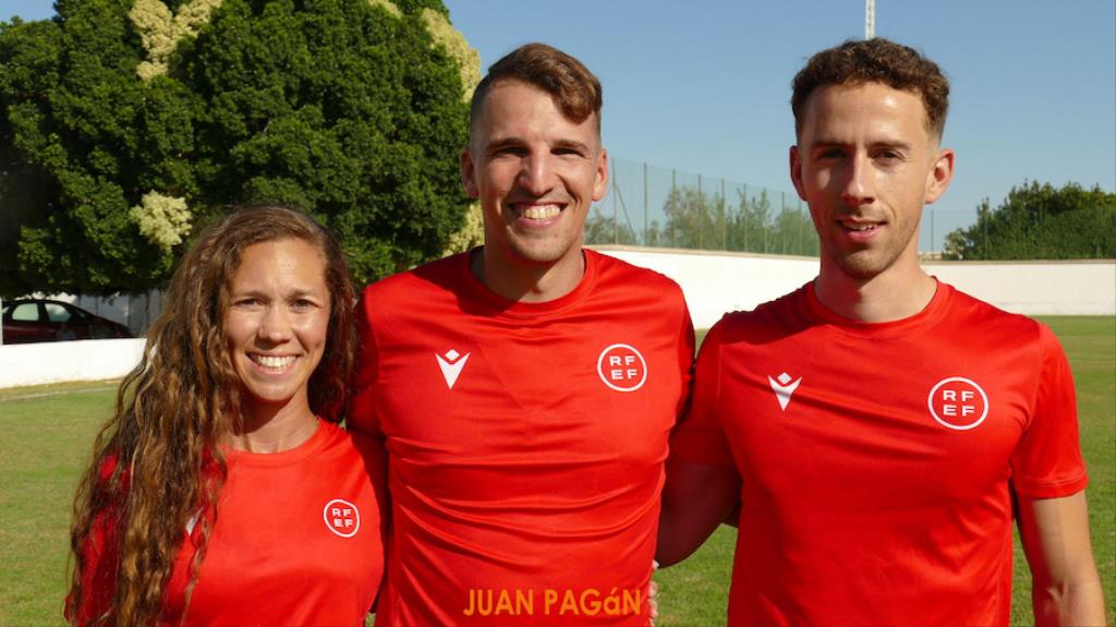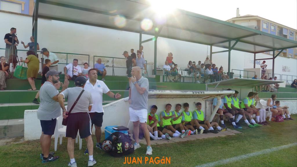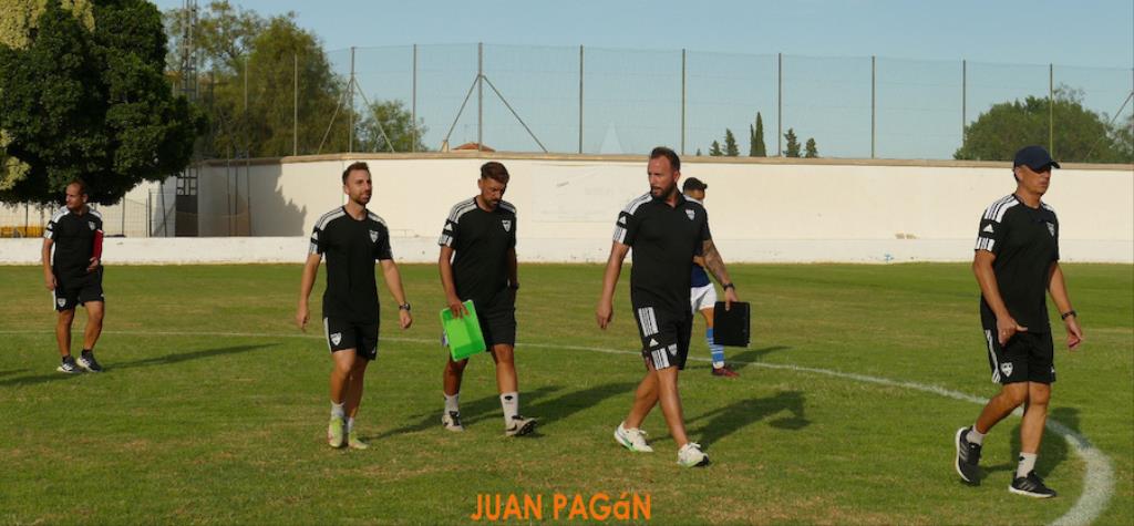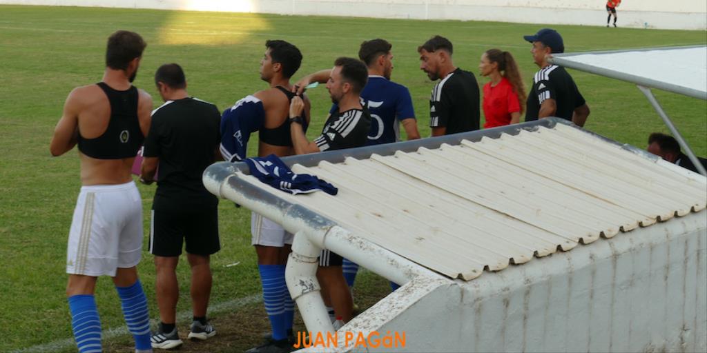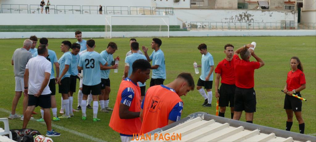 Campos, a quien se observa en la fotografía dando instrucciones a los jugadores durante una pausa de hidratación, resaltó tras el partido que La Unión Atlético sigue sin recibir goles en pretemporada, "seguimos siendo sólidos en defensa, donde concedemos poco. En el aspecto ofensivo es donde más espesos hemos estado, en lo que también ha afectado el terreno de juego", indica quien señala que el segundo acto ha sido mejor que el primero, pero matizando que no fue un buen partido para el espectador.